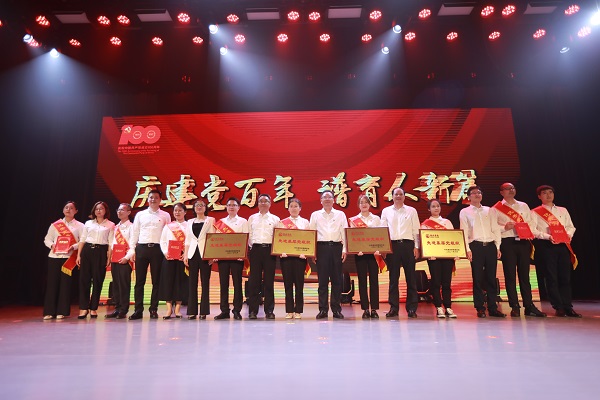为了庆祝中国共产党成立100周年,6月30日下午,402永利手机版网址“庆建党百年、谱育人新篇”主题党日活动暨“两优一先”表彰大会在中校区大学生活动中心隆重举行。校党政领导班子、求真学院首任校长蔡清江出席,全体师生党员代表、优秀校友代表、二级学院领导班子成员、全体机关部门工作人员等400余人参加了会议。会议由校党委副书记唐华主持。