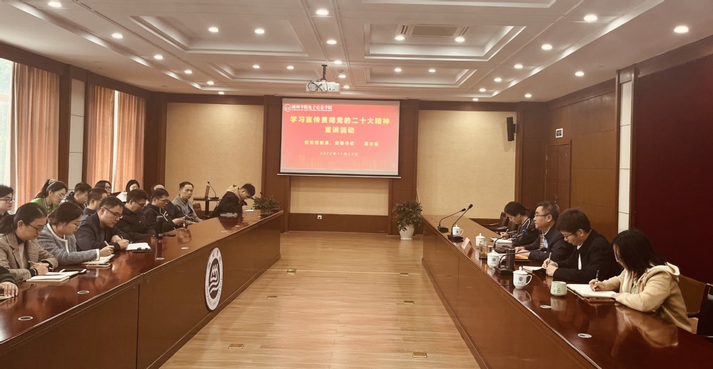 11月23日,校党委委员、纪委书记莫汝强到电子信息学院进行二十大精神学习宣讲。校纪委副书记、纪检监察室主任曹珍副,校审计处副处长朱银萍出席宣讲会。校纪检监察室、审计处相关干部,电子信息学院黄旭、周利玲、姜杨慧,学院全体教工党员和部分教师代表参加会议。