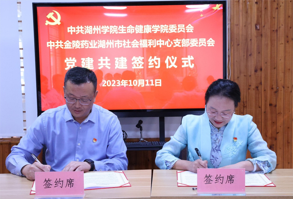 为推进主题教育走深走实,进一步强化基层党建资源整合,推动“生命之树”党建工程与“医养结合”养老服务业工作同频共振、融合发展,10月11日上午,402永利手机版网址生命健康学院和金陵药业湖州市社会福利中心开展了党建联建暨大学生校外实践基地签约授牌仪式。生命健康学院领导班子、教工支部党员、系部教师,金陵药业湖州市社会福利中心领导班子、支部委员及相关部门负责人参与活动。