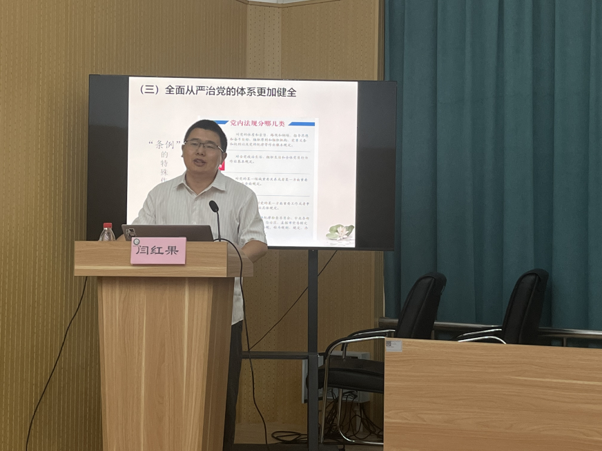 闫红果博士以《深入学习习近平总书记关于全面从严治党的重要论述》为题,从《中国共产党纪律处分条例》的发展历程、主要内容及修订重点进行详细讲解,并结合实例从坚定不移全面从严治党的时代背景、习近平总书记关于全面从严治党的战略部署、新时代做遵规守纪的共产党员等三个方面作了一堂精彩的报告。